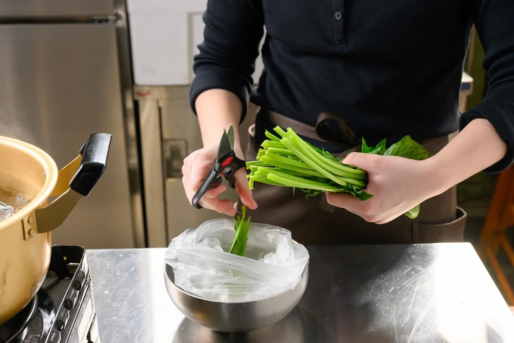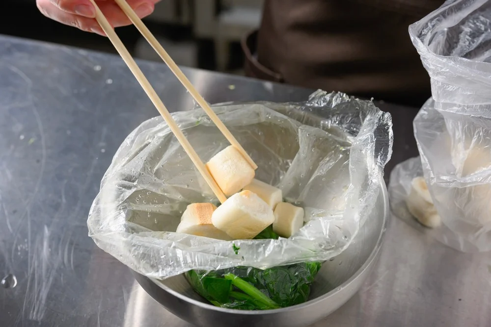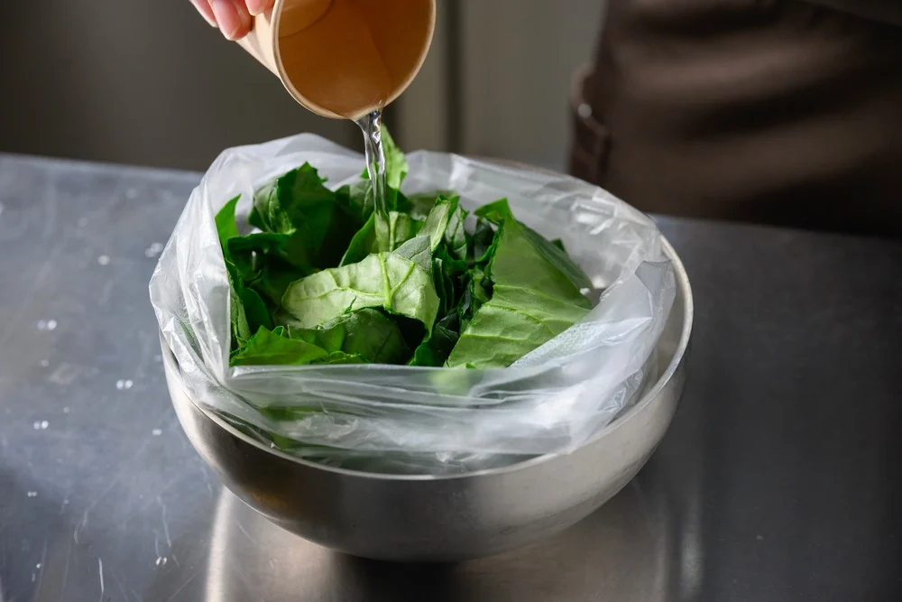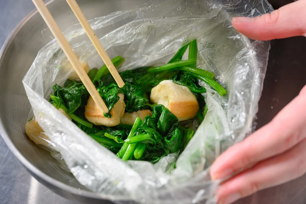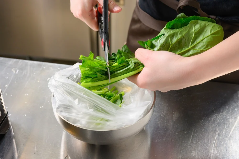 - 炊飯袋の中にほうれん草をカットして入れる。