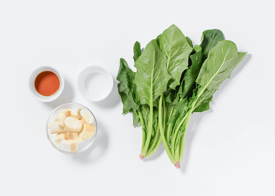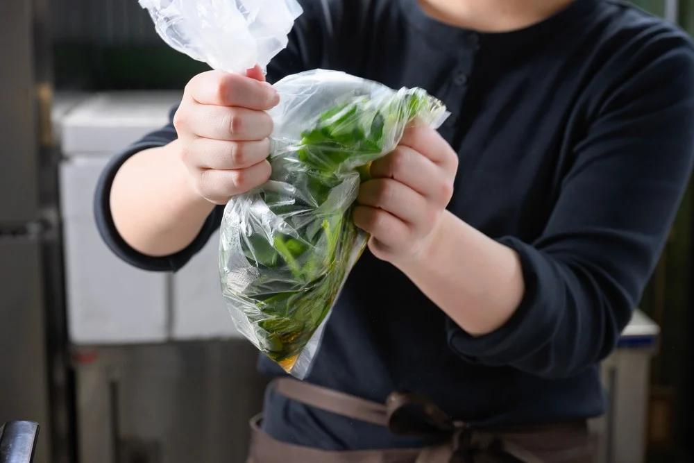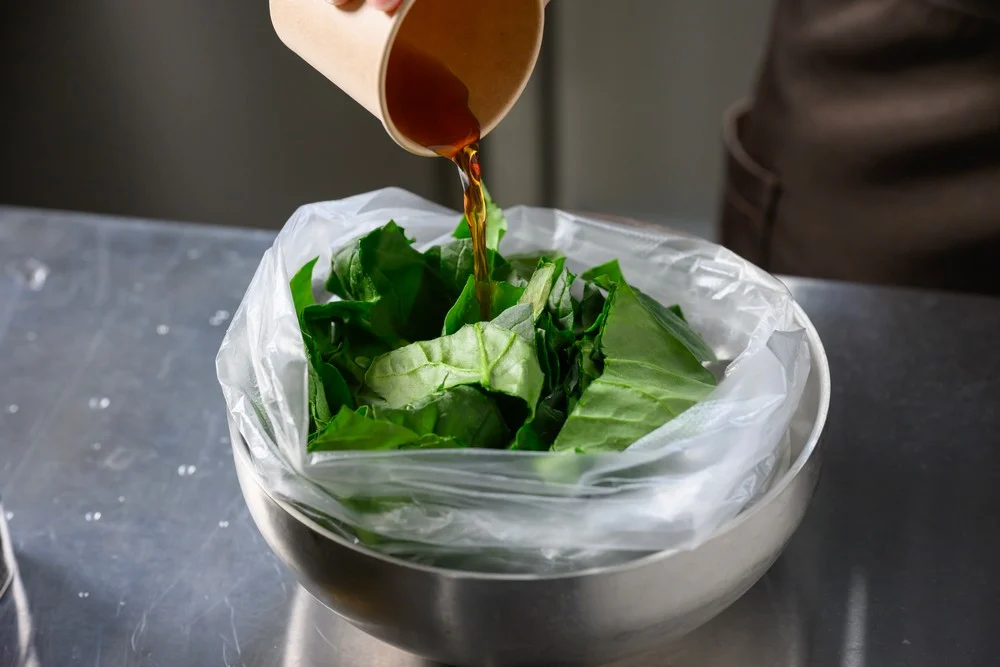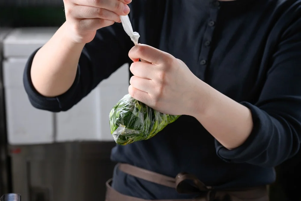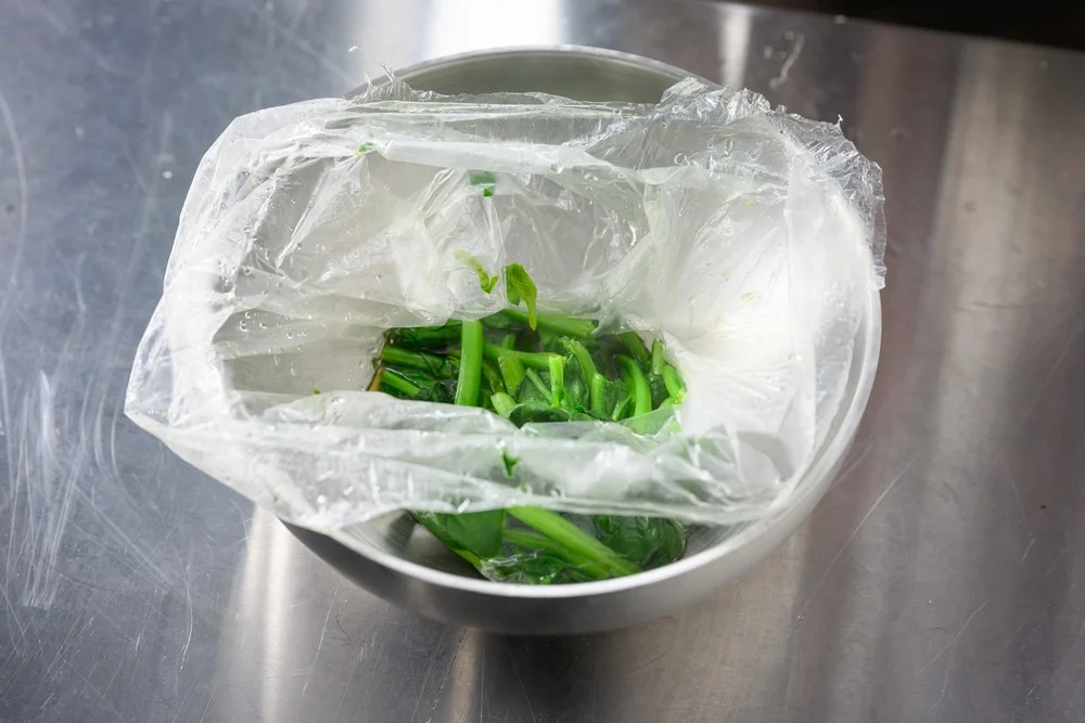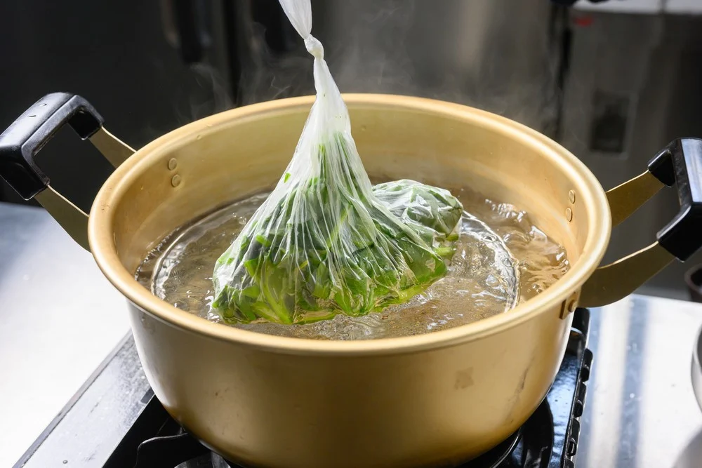 - 炊飯袋の中にほうれん草をカットして入れる。